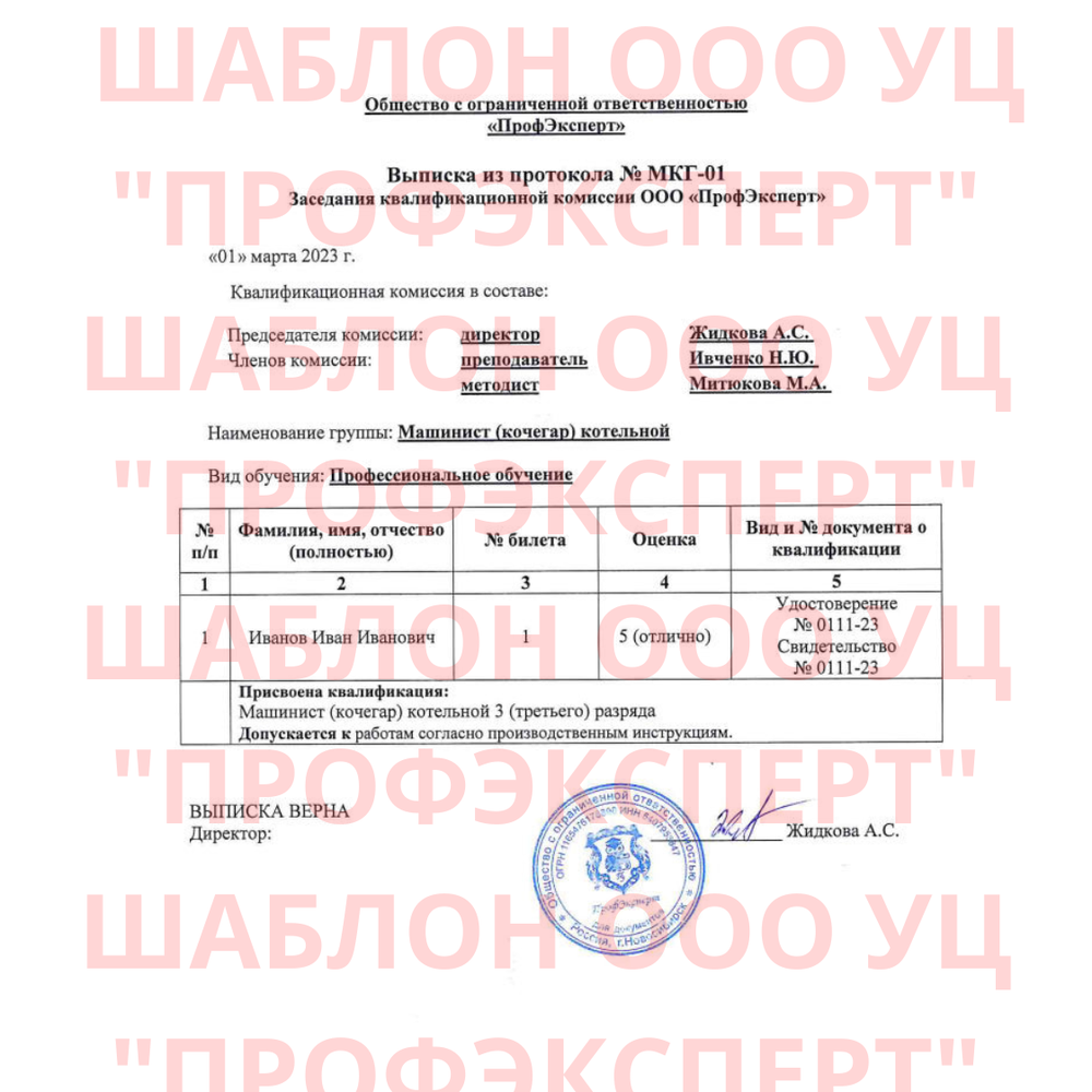 По окончании обучения вам будет выдана такая же выписка из протокола, на ваше ФИО, по вашей профессии, с актуальной датой, номером протокола, удостоверения и свидетельства.